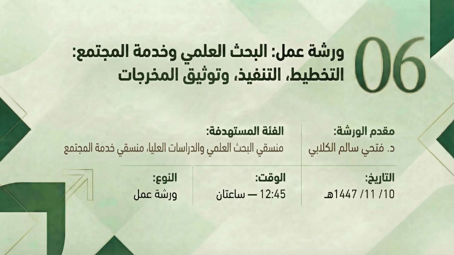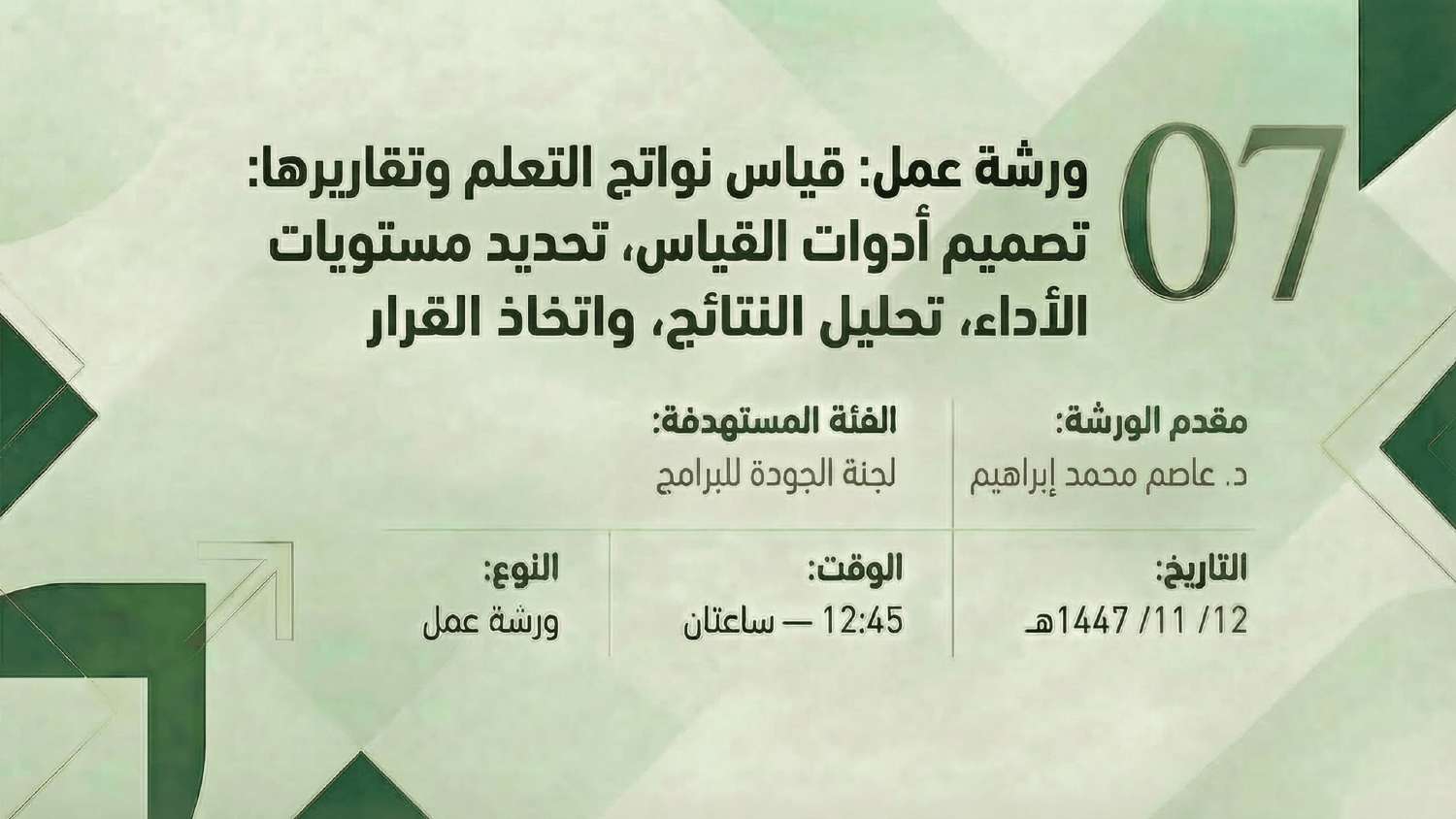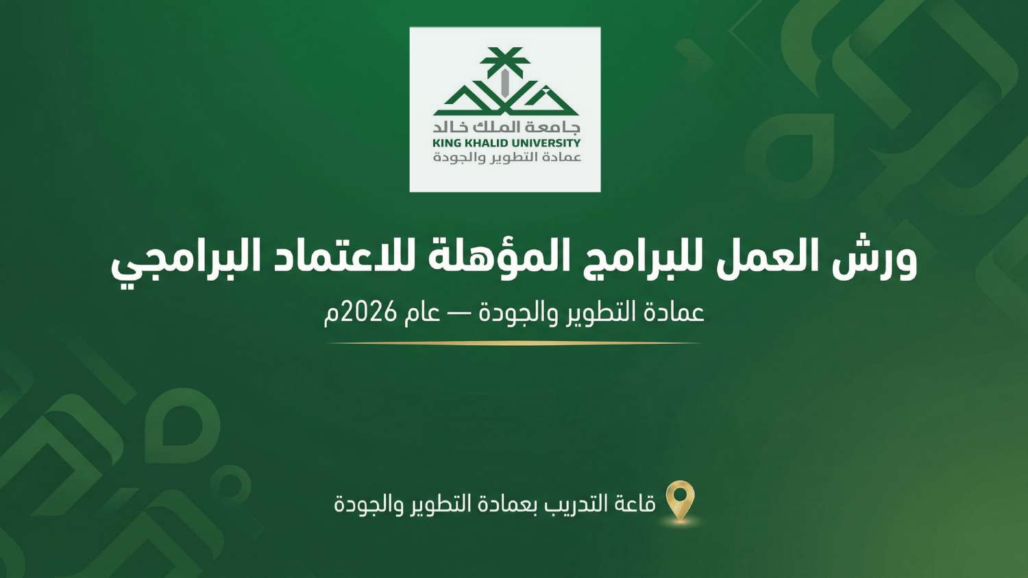 تُعلن عمادة التطوير والجودة بجامعة الملك خالد عن تنظيم سلسلة من ورش العمل الموجهة للبرامج الأكاديمية المؤهلة للاعتماد البرامجي، وذلك ضمن جهودها لتعزيز جودة المخرجات التعليمية والارتقاء بكفاءة البرامج. تُعقد هذه الورش خلال عام 2026م، في الفترة من 20-10-1447هـ (الموافق 8 أبريل 2026م) إلى 17-11-1447هـ (الموافق 5 مايو 2026م)، حيث تستهدف دعم جاهزية البرامج واستيفائها لمتطلبات ومعايير الاعتماد، وسيكون الحضور حضوريًا بمقر العمادة في قاعة التدريب.