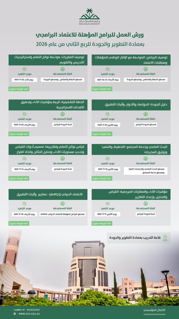 تُعلن عمادة التطوير والجودة بجامعة الملك خالد عن تنظيم سلسلة من ورش العمل الموجهة للبرامج الأكاديمية المؤهلة للاعتماد البرامجي، وذلك ضمن جهودها لتعزيز جودة المخرجات التعليمية والارتقاء بكفاءة البرامج. تُعقد هذه الورش خلال عام 2026م، في الفترة من 20-10-1447هـ (الموافق 8 أبريل 2026م) إلى 17-11-1447هـ (الموافق 5 مايو 2026م)، حيث تستهدف دعم جاهزية البرامج واستيفائها لمتطلبات ومعايير الاعتماد، وسيكون الحضور حضوريًا بمقر العمادة في قاعة التدريب.