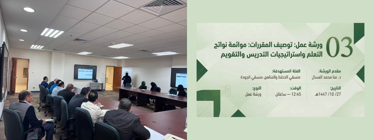 نظّمت عمادة التطوير والجودة ورشة عمل بعنوان "توصيف البرنامج: المواءمة مع الإطار الوطني للمؤهلات ومتطلبات الاعتماد"، وذلك يوم الاثنين الموافق 25-10-1447هـ في القاعة التدريبية بعمادة التطوير والجودة، بمشاركة عدد من المختصين والمهتمين في مجال الجودة والاعتماد الأكاديمي وتطوير البرامج الأكاديمية.